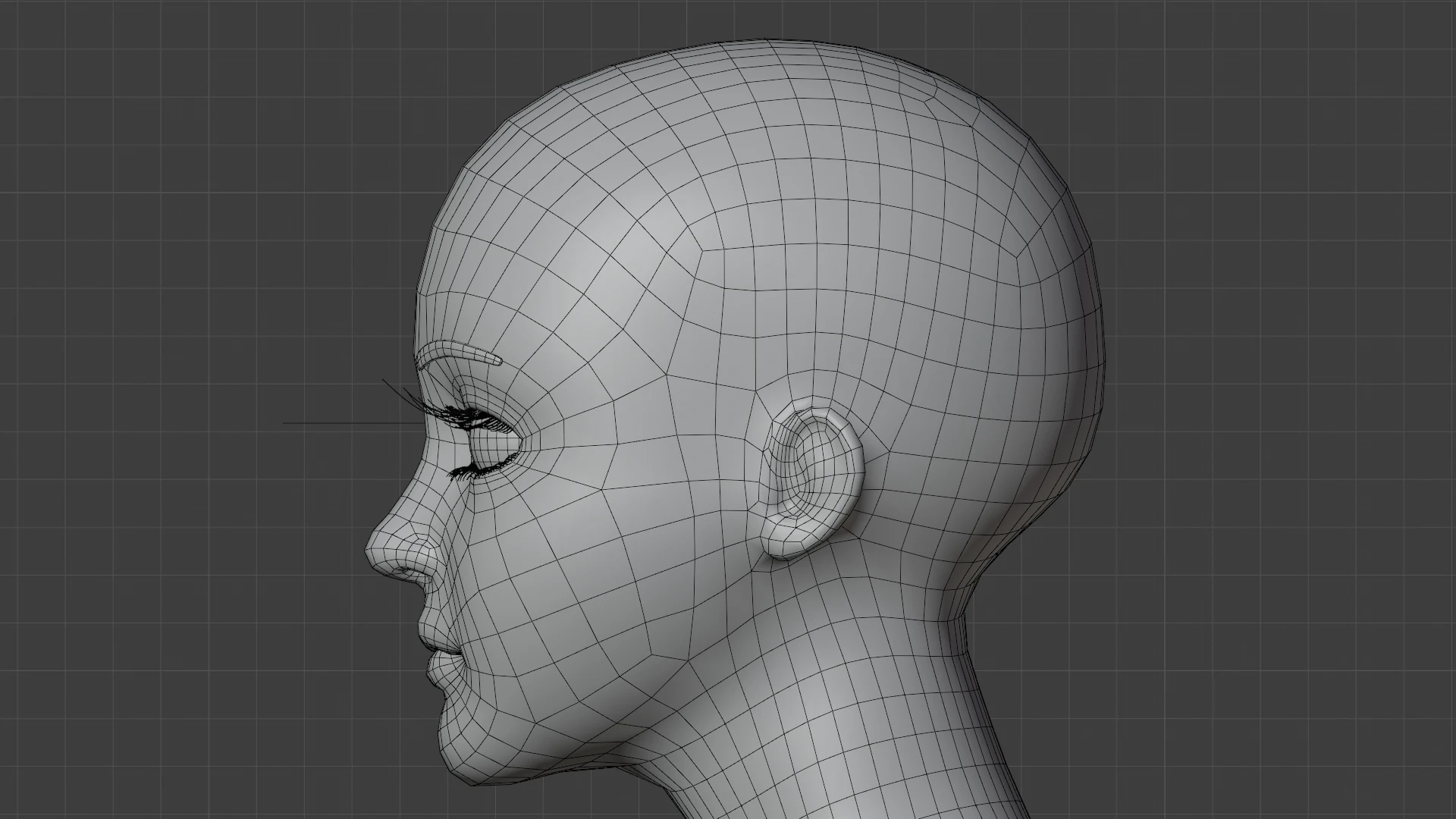 Side profile of the retopologized model showing proper edge loops and topology flow for facial deformation.